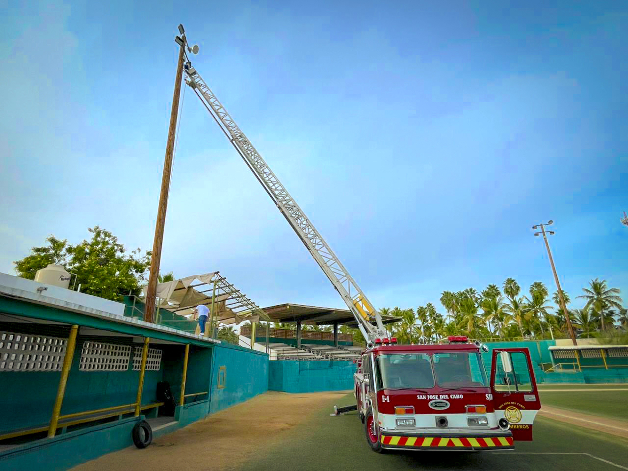 Apoyan Bomberos de San José del Cabo rehabilitación de luminarias en centros deportivos de la zona norte