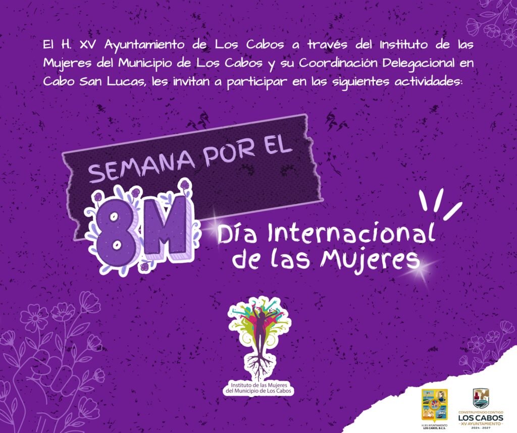 Los Cabos, Baja California Sur.– En el marco del Día Internacional de la Mujer, el Instituto de las Mujeres del Municipio de Los Cabos (IMMLC) presentó la programación de la “Semana por el 8M” en Cabo San Lucas, con actividades deportivas, formativas y simbólicas orientadas a promover la igualdad y la erradicación de la violencia de género.