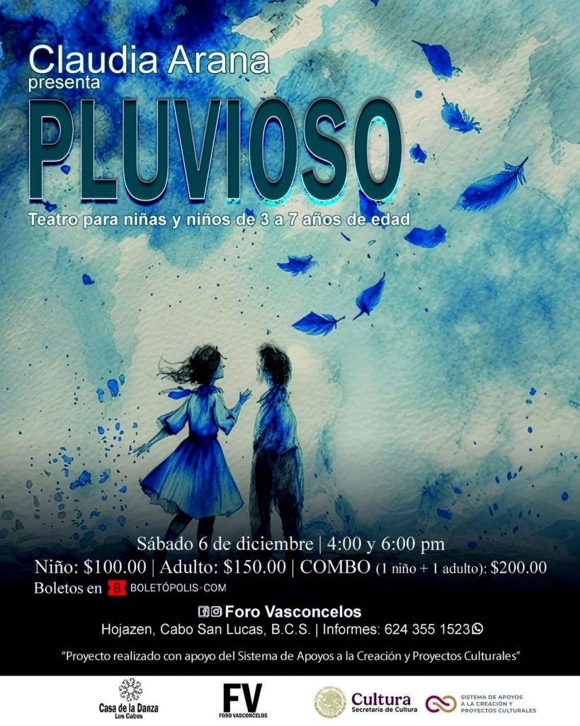 El ICA informó que este fin de semana se presentará la obra de teatro “Pluvioso”, dirigida a niñas y niños de 3 a 7 años, a cargo de la artista escénica Claudia Arana. Las funciones se realizarán el sábado 06 de diciembre, en dos horarios: 16:00 y 18:00 horas, en el Foro Vasconcelos de Cabo San Lucas. Esta puesta en escena busca acercar a la primera infancia a experiencias creativas que estimulen la imaginación y el juego. Los costos de acceso serán: niñas y niños $100; personas adultas $150; y el combo de una persona adulta y una niña o niño $200. Los boletos están disponibles a través de la plataforma Boletópolis.