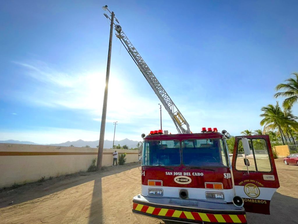 El camión escalera, con una longitud de 30 metros, es operado exclusivamente por personal especializado del Departamento de Bomberos de San José del Cabo, garantizando la seguridad de las cuadrillas que realizan los trabajos en altura.