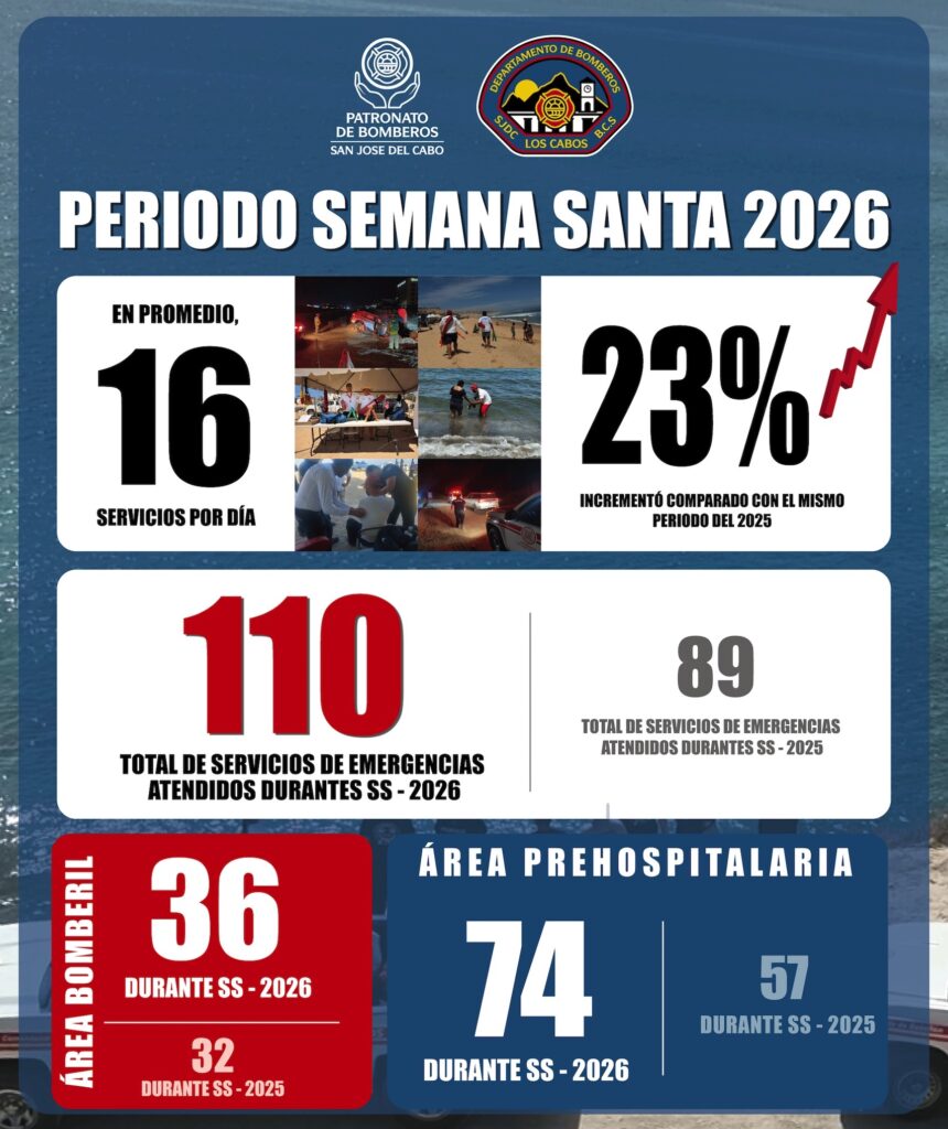 Los Cabos, Baja California Sur.– Tras concluir el periodo de semana santa 2026, el Departamento de Bomberos de San José del Cabo, reveló que los servicios de emergencias atendidos durante este lapso se incrementaron al 23 %, reportando un acumulado de 110 servicios brindados a lo largo de esta semana del 2026, mientras que en el mismo periodo pero del 2025, se atendieron 89 servicios, así lo dio a conocer el comandante del Departamento de Bomberos de San José del Cabo, Omar Barreras Núñez.