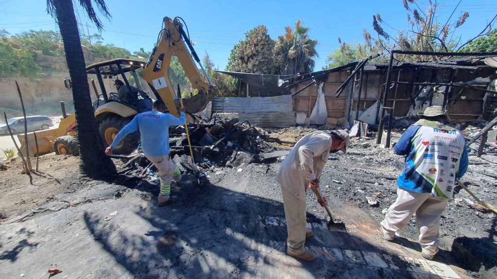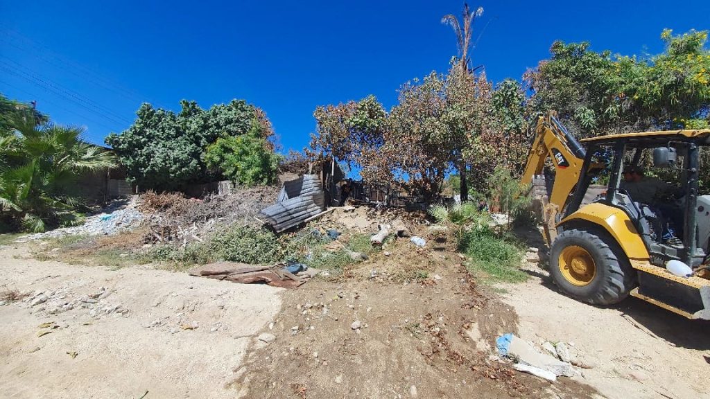 Los Cabos, Baja California Sur.– En atención a una familia afectada por un incendio, el XV Ayuntamiento de Los Cabos, a través de la Dirección General de Servicios Públicos, llevó a cabo labores de retiro de escombros, materiales dañados y árboles con afectaciones en el vado de Santa Rosa, como parte de las acciones de apoyo comunitario que realiza la dependencia en todo el municipio.