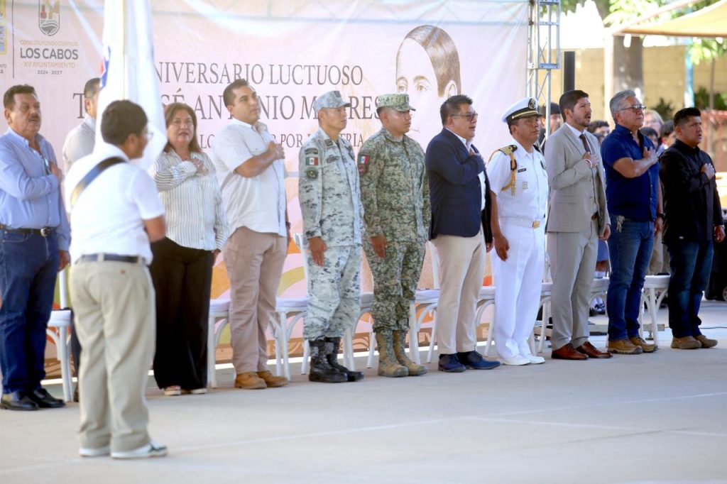 Los Cabos, Baja California Sur.– En representación del presidente municipal Christian Agúndez Gómez, el secretario general Alberto Rentería Santana encabezó este viernes 21 de noviembre la ceremonia cívica por el 178° aniversario luctuoso del teniente José Antonio Mijares. El acto se llevó a cabo en la Escuela Secundaria que porta el nombre del héroe sudcaliforniano, con la participación de autoridades municipales, representantes de las fuerzas armadas, personal docente y alumnado.