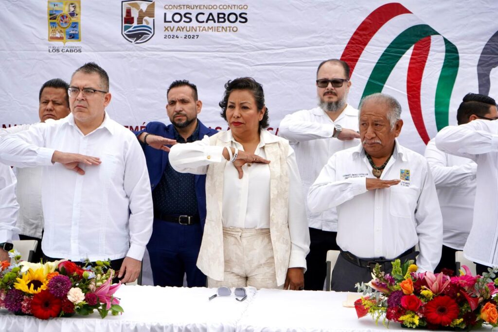 Los Cabos, Baja California Sur.– En el marco del 220° aniversario del natalicio de Benito Juárez García, autoridades municipales, educativas y representantes de la sociedad civil llevaron a cabo un acto cívico en su honor en la cancha de la colonia Benito Juárez, en Cabo San Lucas.
