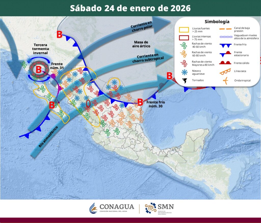 Detalló, que lo anterior será originado por la presencia de una ciculación ciclónica que estará interactuando con los frentes fríos 30 y 31, así como corrientes en chorro polar y subtropical, lo cual dará origen a la tercera Tormenta Invernal de la temporada.