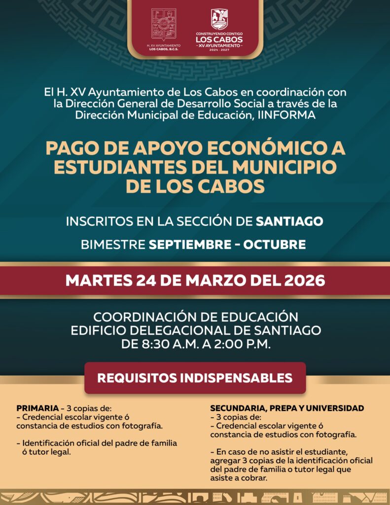 Los Cabos, Baja California Sur.– El XV Ayuntamiento de Los Cabos, en coordinación con la Dirección General de Desarrollo Social y la Dirección Municipal de Educación, informa a la comunidad estudiantil sobre la próxima entrega del pago de apoyo económico correspondiente al bimestre septiembre–octubre, que se llevará a cabo de manera simultánea en todas las delegaciones del municipio el próximo martes 24 de marzo.