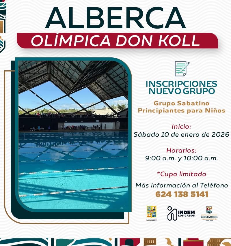 Los Cabos, Baja California Sur.– El XV Ayuntamiento de Los Cabos, a través del Instituto del Deporte del Municipio de Los Cabos (INDEM), promueve la actividad física y la formación deportiva desde edades tempranas, brindando a la niñez espacios seguros y adecuados para el aprendizaje en sus diversas disciplinas; en ese sentido se informa la apertura de un nuevo grupo sabatino de natación dirigido a la niñez en nivel principiantes, el cual se impartirá en la Alberca Olímpica Don Koll, en Cabo San Lucas.