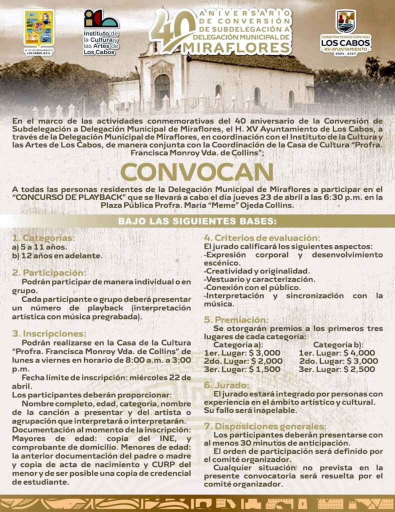 Los Cabos, Baja California Sur.– Con motivo del 40º Aniversario de la Conversión de Subdelegación de Miraflores en Delegación Municipal, el XV Ayuntamiento de Los Cabos invita a la ciudadanía a participar en las actividades conmemorativas que se realizarán los días jueves 23 y viernes 24 de abril en esta comunidad.