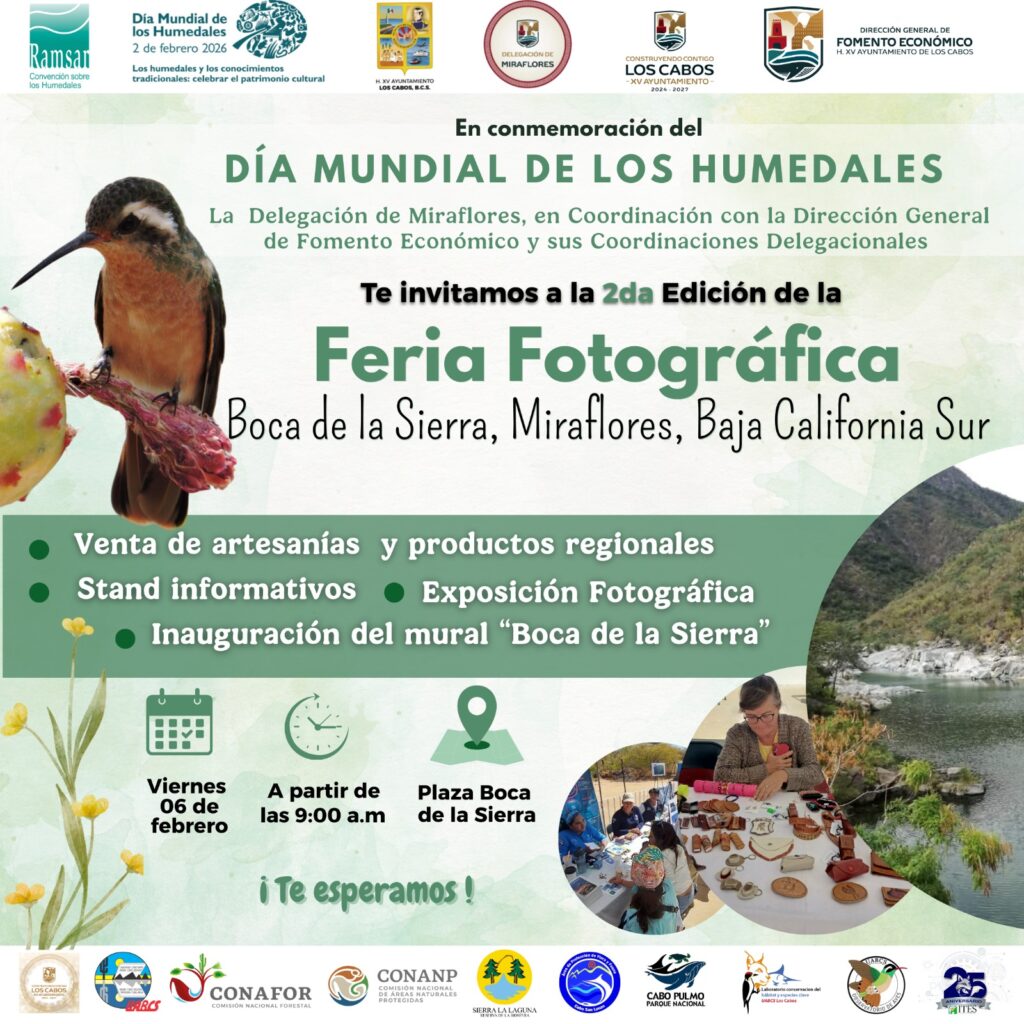 Los Cabos, Baja California Sur.– En el marco del Día Mundial de los Humedales, el XV Ayuntamiento de Los Cabos, que preside Christian Agúndez Gómez, hace una atenta invitación a la ciudadanía a participar en las actividades conmemorativas que se llevarán a cabo en la delegación de Miraflores, con el propósito de fortalecer la conciencia ambiental y destacar la relevancia de estos ecosistemas para el desarrollo sostenible del municipio.
