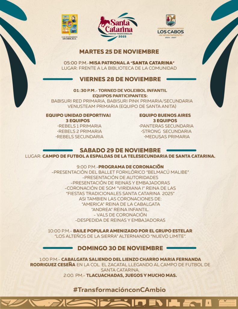 Los Cabos, Baja California Sur.– El XV Ayuntamiento de Los Cabos, a través de la Dirección General de Desarrollo Social, a través de la Dirección Municipal de Organización y Participación Ciudadana, invita a la comunidad a participar en las Fiestas Tradicionales de Santa Catarina 2025, que se realizarán del 25 al 30 de noviembre, con un programa que integra actividades religiosas, deportivas, culturales y artísticas para fortalecer la convivencia y preservar las tradiciones de esta localidad.