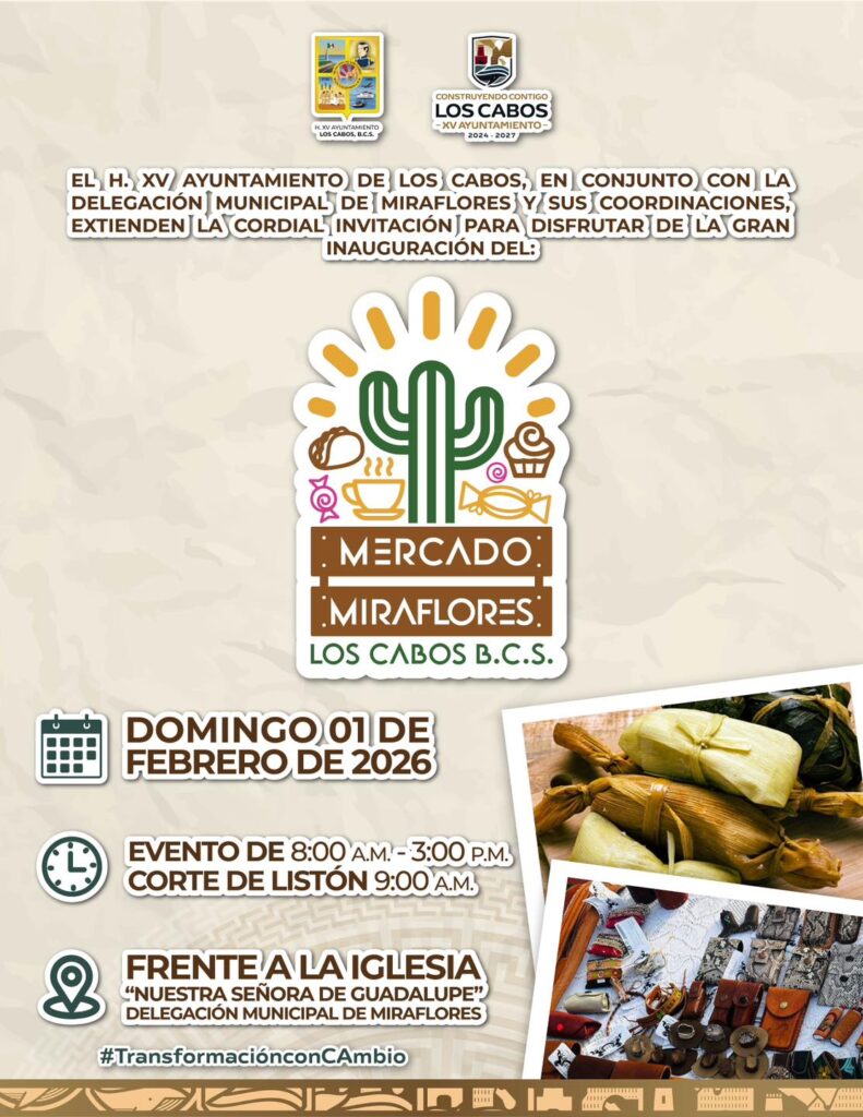 Los Cabos, Baja California Sur.– El XV Ayuntamiento de Los Cabos, en coordinación con la Delegación Municipal de Miraflores y la Coordinación de Fomento Económico, extiende la invitación a la ciudadanía y visitantes a la gran inauguración del “Mercado Miraflores”, un nuevo espacio diseñado para impulsar la economía local y visibilizar la riqueza productiva de la zona rural del municipio.