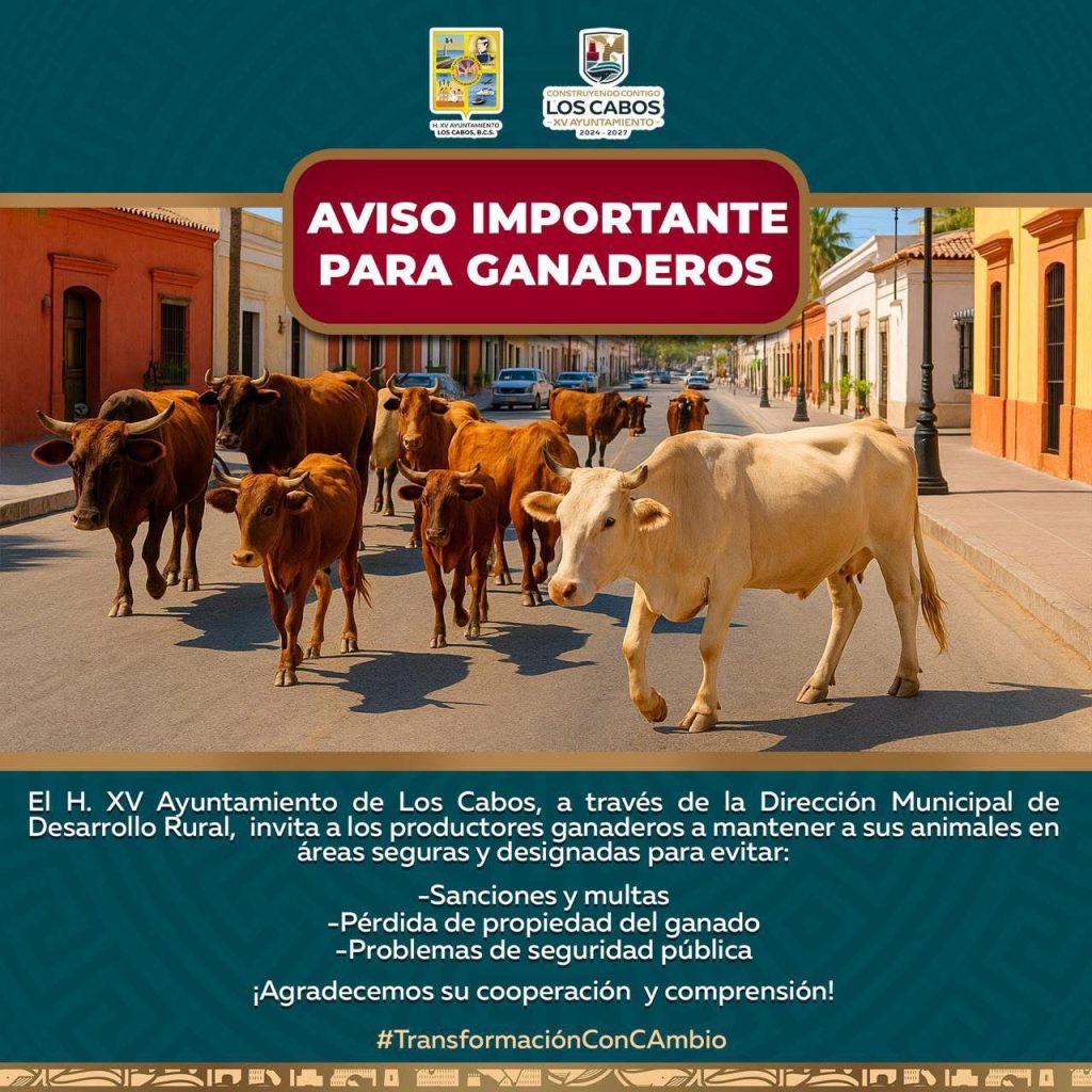 Los Cabos, Baja California Sur.– Con el propósito de fortalecer el ordenamiento territorial y prevenir riesgos para la población, el XV Ayuntamiento de Los Cabos, a través de la Dirección Municipal de Desarrollo Rural, reitera el llamado a personas productoras ganaderas para mantener a sus animales dentro de áreas seguras y debidamente designadas, evitando sanciones, pérdidas económicas y situaciones que comprometan la seguridad en las zonas urbanas.