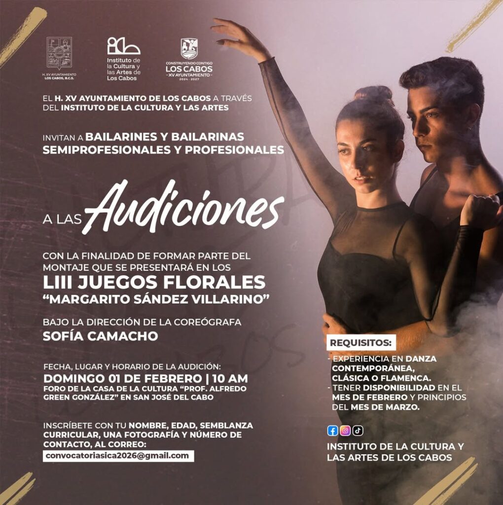 La convocatoria está dirigida a intérpretes con experiencia en danza contemporánea, clásica o flamenca, quienes formarán parte de este proyecto escénico bajo la dirección de la coreógrafa Sofía Camacho, como parte de las actividades culturales que impulsa el XV Ayuntamiento de Los Cabos.
