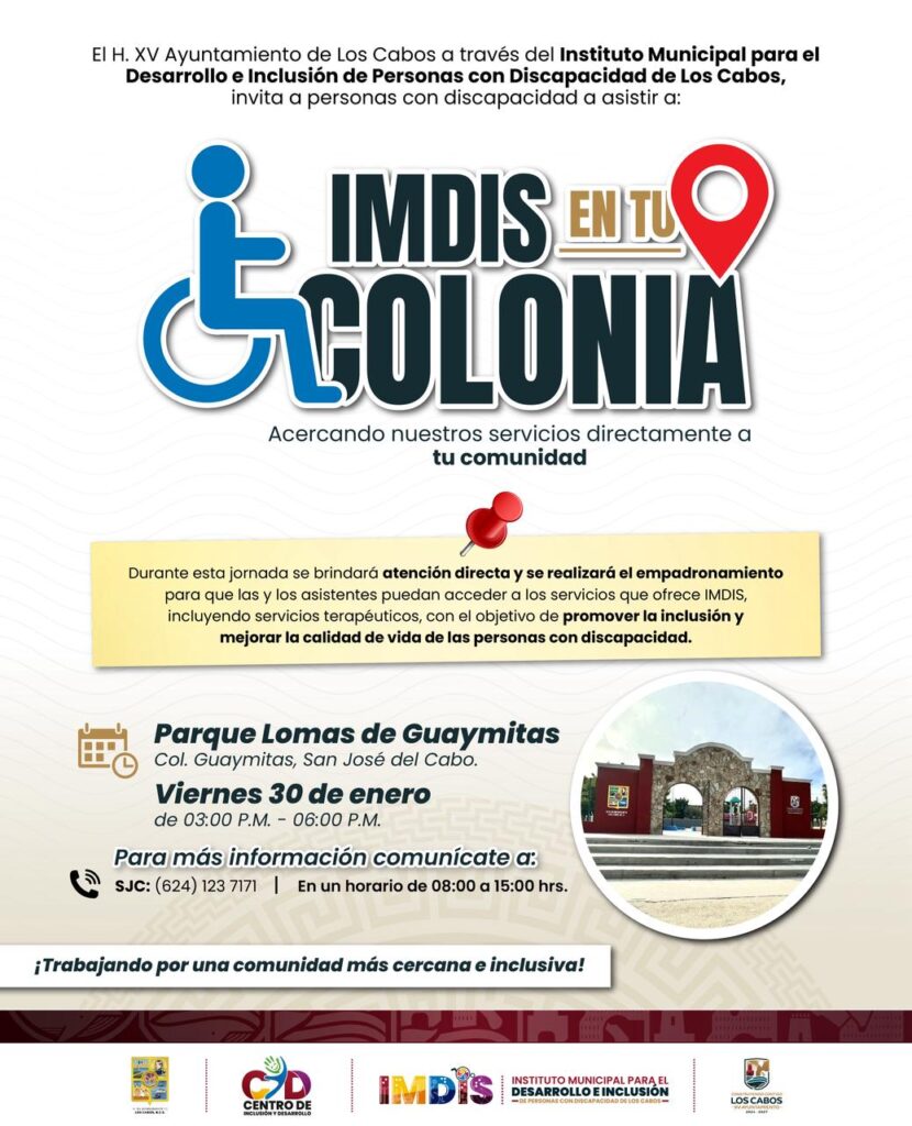 Los Cabos, Baja California Sur.– Con la puesta en marcha del programa  IMDIS en tu Colonia, el Gobierno de Los Cabos a través del Instituto Municipal para el Desarrollo e Inclusión de Personas con Discapacidad (IMDIS), acerca servicios de salud, terapias, talleres e integración entre la comunidad con discapacidad motriz y la autoridad municipal.