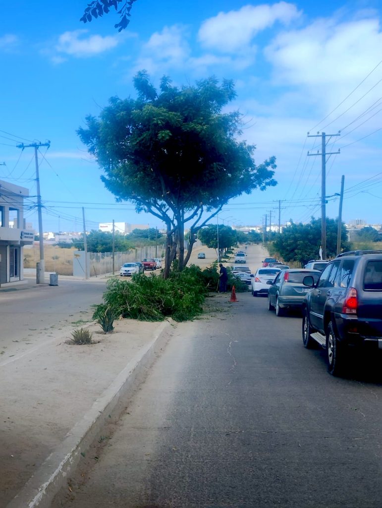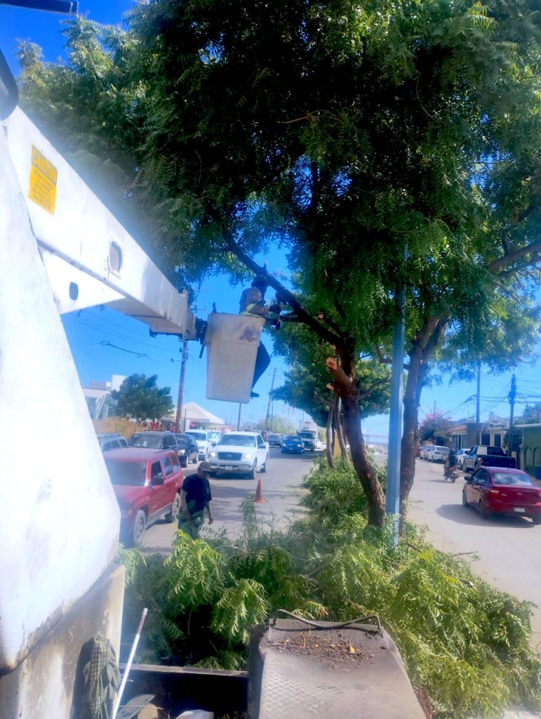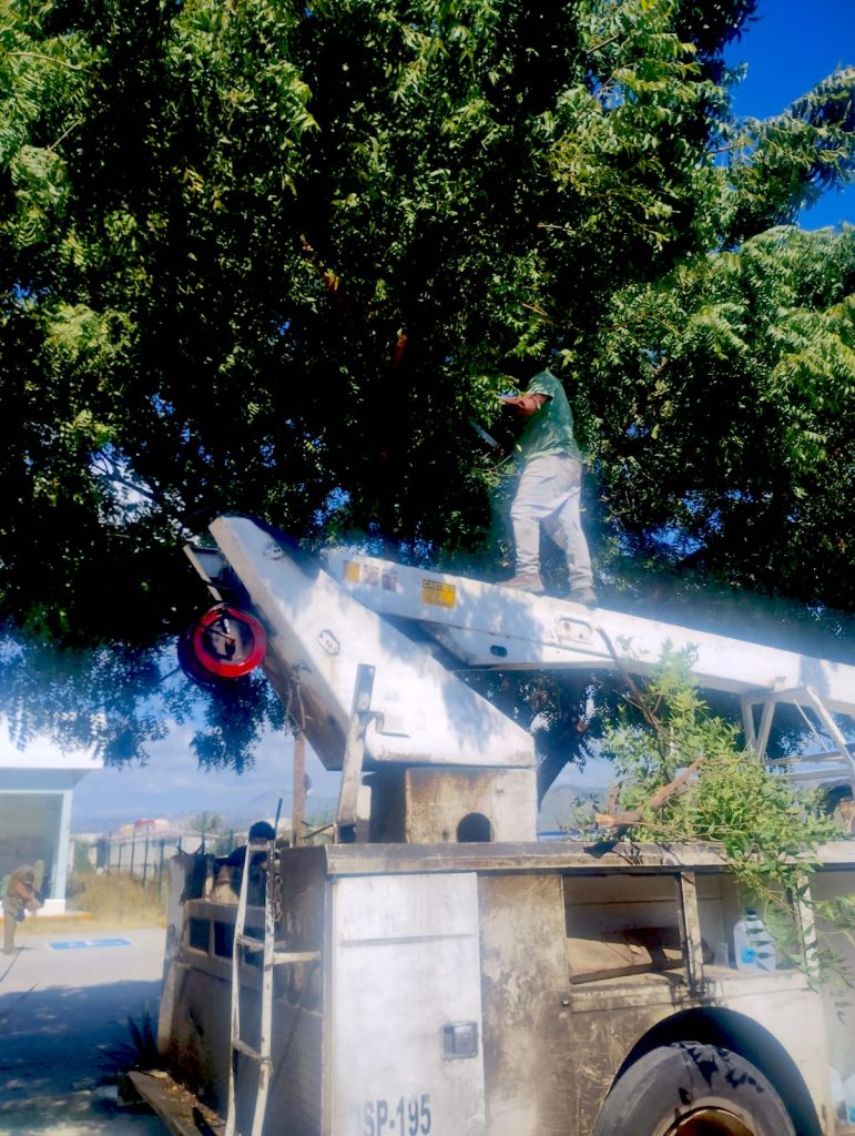 De igual manera, atendiendo solicitudes ciudadanas, el equipo de Áreas Verdes realizó la poda de una bugambilia frondosa y un árbol en la Casa de Día de la colonia Los Cangrejos, asegurando el adecuado mantenimiento de este espacio destinado a la atención de personas adultas mayores. También se llevó a cabo la poda de 22 árboles en el plantel Cobach #04, acciones que igualmente requirieron el uso de grúa.
