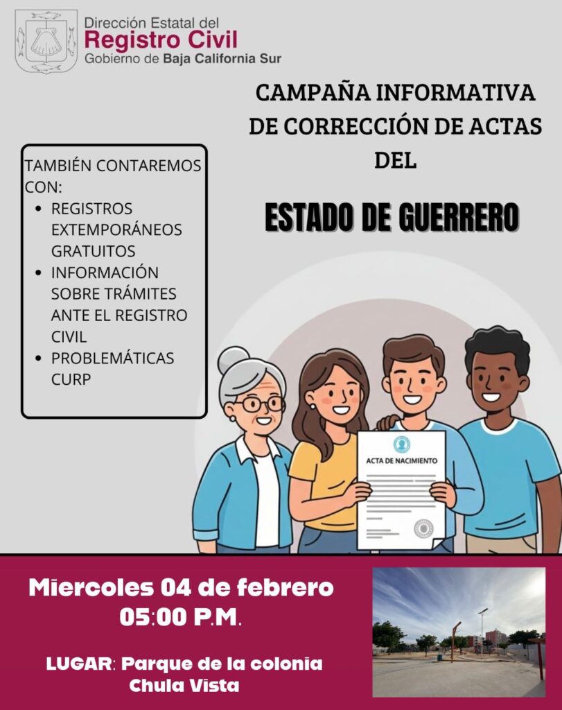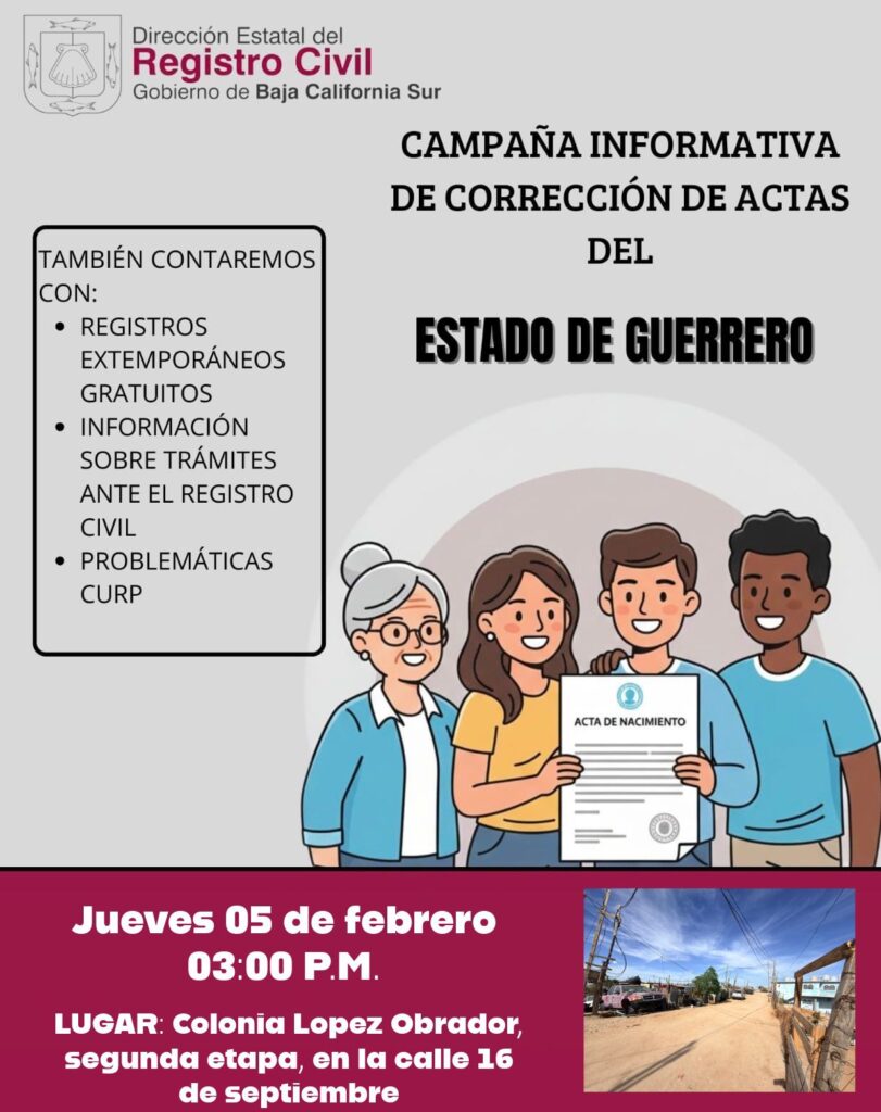 Al respecto, el oficial del Registro Civil en Cabo San Lucas, Omar Cortés Villegas informó que esta semana se llevarán a cabo dos jornadas informativas: el miércoles en la colonia Chula Vista y el jueves en la colonia López Obrador. Asimismo, señaló que estas actividades forman parte de la preparación de un evento especial derivado de un convenio de colaboración con el estado de Guerrero.